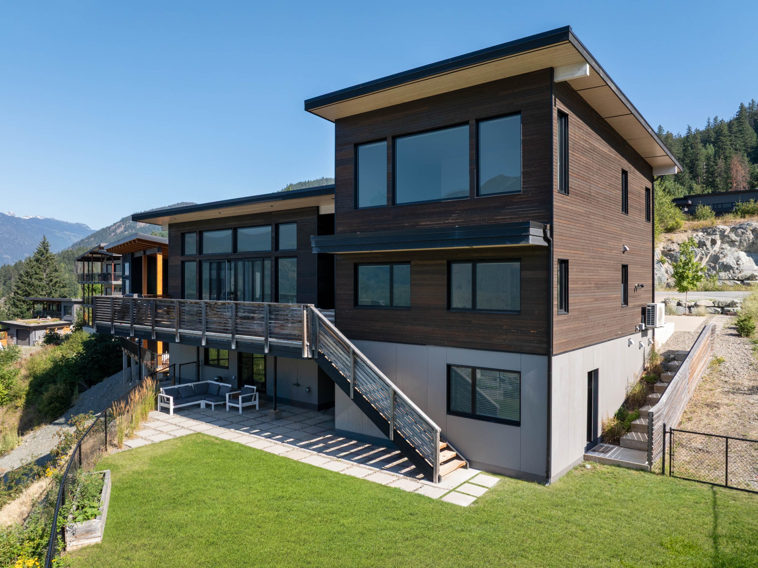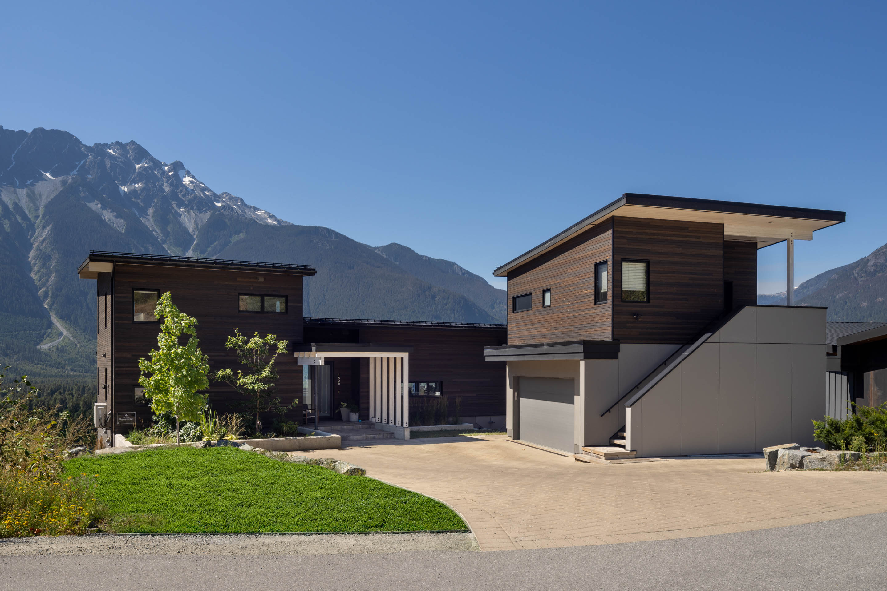 The exterior showcases a beautiful blend of natural and modern materials, with stained cedar siding as the primary finish and fiber cement accents adding a clean, contemporary touch. Large windows capture stunning views of Mount Currie, while the bright, open-concept interior provides inviting spaces designed for everyday living and entertaining.